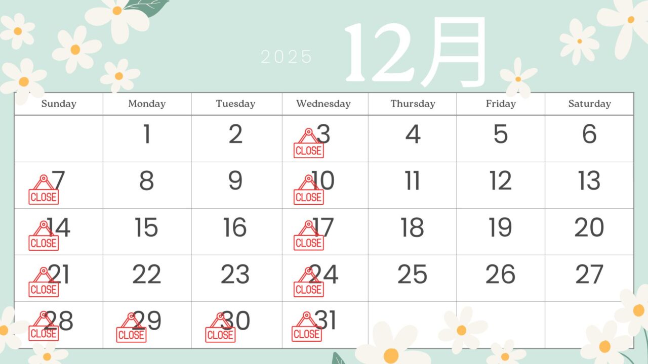 ニュース 12月・年末年始のお休み shirokuma49 2025年10月6日 / 2025年12月1日 12月のお休みです。 カレンダーの通り、水曜日・日曜日が定休日のため休みになります。 年末年始のお休みは 12月28日〜1月4日までお休み。 1月5日〜通常通り営業開始します。 休み期間中・休診中の時間は、ご連絡はLINE@からお願いします↓↓↓